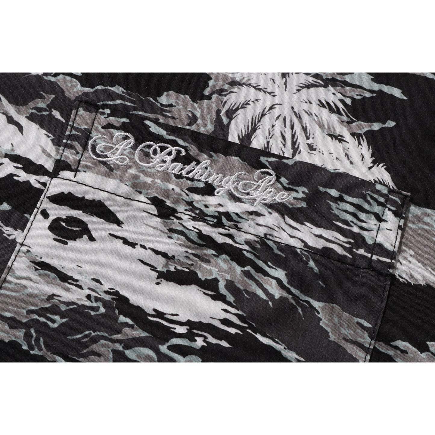 Introducing the PALM TREE CAMO pattern from A BATHING APE’s Spring/Summer 2025 collection, blending a tropical vibe with urban edge. This design overlays BAPE’s signature tiger camo with palm tree motifs, creating a unique resort-inspired look. The collection features essential summer pieces, including the classic shark hoodie, T-shirts, open-collar shirts, and beach shorts suitable for city streets or seaside relaxation. This short-sleeved open-collar shirt is crafted from recycled lyocell fiber, known for its sheen and softness, and is detailed with an embroidered A BATHING APE logo on the left chest pocket.