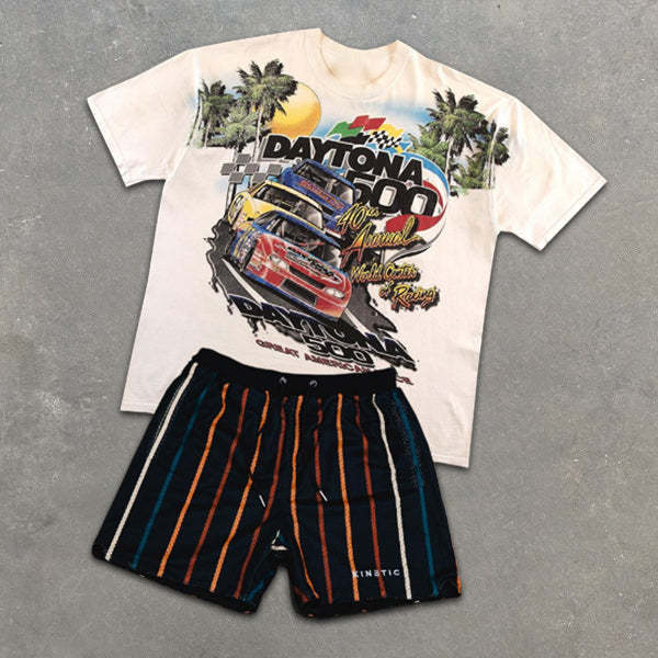 Racing Print Short Sleeve Striped Shorts Two-Piece Set